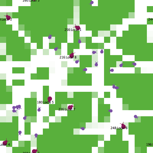 In addition, automated bugs can be included in the model. They wander around the world randomly, eating grass.