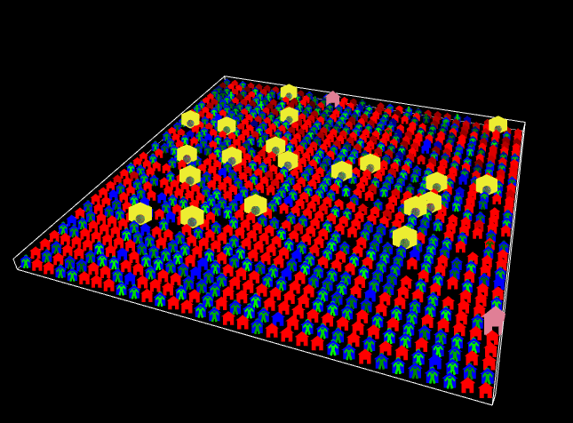At default, the people move between houses, houses are being bought and sold and renters become owners and vice-versa. There are some foreclosures, but not too many. By keeping the interest rate parameter constant, the system stabilizes until no house is being sold any more and there is only movement of people between the houses.