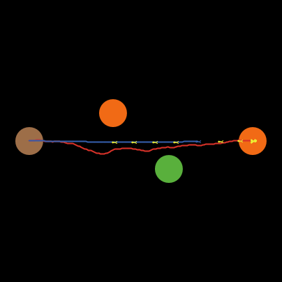 Each subsequent ant follows the ant ahead of it by heading directly towards it before it takes each step. The follower ants do not leave a trace. The yellow line of ants, however, traces out a curve in the drawing. The last ant to go leaves a blue trace.