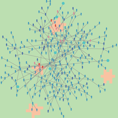 Regular nodes can adopt information or correct information. Regular nodes are represented by person shapes. Regular nodes have an individual "change" property; the values for these are exponentially distributed with the mean set by the "openness-to-change" slider. Researchers have adopted? and corrected? properties but do not adopt and will always have correct information. Researchers have a research-delay property which affects when they begin to exert influence in the network. Researchers are represented by cyan circle shapes in the network.