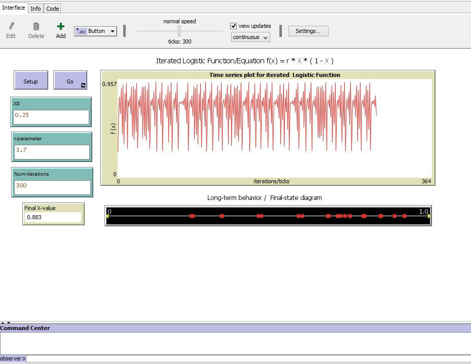 Every time-step (tick) an iteration is performed with the result plotted on the time-series plot and a point is generated (i.e. a red color turtle is created). The last 10% of turtles are placed/plotted on the phinal state diagram.