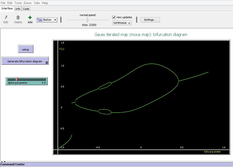 The β parameter is shown on the horizontal axis of the plot generated in NetLogo World View Window and the vertical axis shows the set of values of the iterated Gaussian function f(x) = exp (-α * X^2) + β .