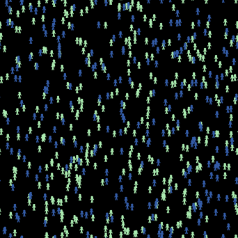 The model starts with a human population consisting of susceptible (green color) and vaccinated (blue color) people. Once an infected case (orange color) appears in the population, it will pass the disease to one of the susceptible people nearby (within a radius of 1.5) at the defined transmission rate. The infected people can transmit the disease for 14 days. By the 15th day of being infected, the infected people die (disappear from the model) at the defined mortality or recover and become immune (blue color).