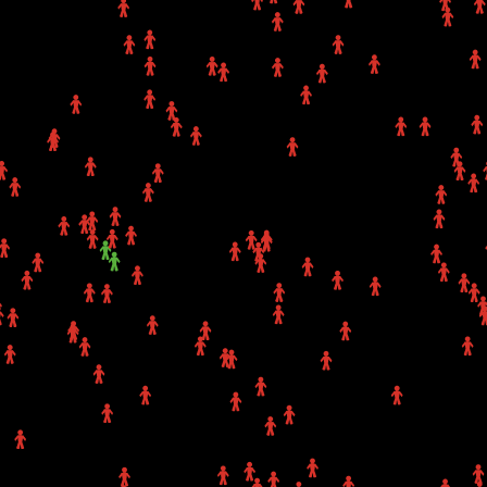 The colors of the individuals indicate the state of their health. Three colors are used: white individuals are uninfected, red individuals are infected, green individuals are recovered. Once recovered, the individual is permanently immune to the virus.