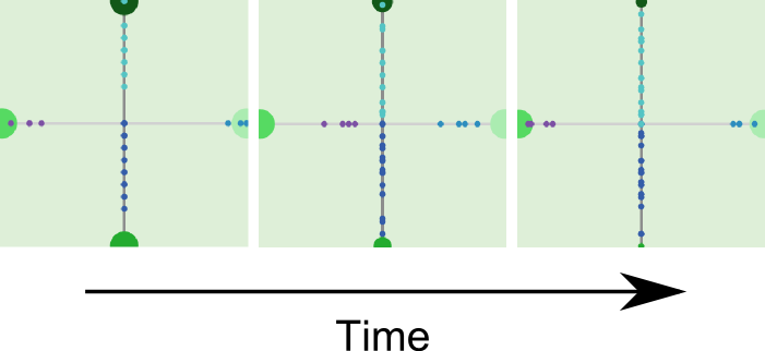 This model illustrates a positive 'transport' feedback loop described in Millington (2013). In this type of feedback a line of reduced or increased resistance to flows of information and/or material results in increased or decreased rates of change in linked entities. This particular example represents the role of roads in tropical deforestation in the Amazon basin (e.g., Malanson et al. 2006), facilitating the flow of people and material from settled (core) regions to frontier (periphery) regions, and vice versa. A positive feedback loop is formed as greater flows of people and materials improve economic returns on activities at the periphery, which in turn stimulate improved and greater flows of materials and people along the roads to core markets and elsewhere. Large green circles indicate resources (e.g., forest), smaller dots indicate resource harvesters, grey lines are roads (darker, lower transport cost).