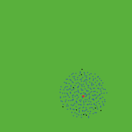 turtles-own[ target block? ] globals[ TARGET_MOUSE ] patches-own[ avaible? ] to Setup ;; (for this model to work with NetLogo's new plotting features, ;; __clear-all-and-reset-ticks should be replaced with clear-all at ;; the beginning of your setup procedure and reset-ticks at the end ;; of the procedure.) __clear-all-and-reset-ticks set TARGET_MOUSE nobody ask patches [ set pcolor green set avaible? true ] ask n-of number_of_turtles patches [ sprout 1[ set color black set target nobody set block? false ] ] end to Go every 0 [ move ] Mouse-Control end to Mouse-Control if mouse-down? [ ifelse (not Made_Wall?) [ if TARGET_MOUSE != nobody [ ask TARGET_MOUSE [set pcolor green]] set TARGET_MOUSE patch mouse-xcor mouse-ycor ask TARGET_MOUSE [set pcolor red] ] [ ask patch mouse-xcor mouse-ycor[ set pcolor grey set avaible? false ] ] ] ask turtles [ set target TARGET_MOUSE ] end to move ask turtles[ set color black ifelse (target = nobody) [ right random 90 left random 90 ][ if (not block?) [face target] set block? false ] let front (turtle-set ( other turtles in-cone 2 70 )) let front_wall (patch-set patches in-cone 2 70 with [not avaible?]) ifelse (count front = 0 and count front_wall = 0) [fd 0.5] [set color blue right random 90 left random 90 set block? true set target nobody] ] end to Reset-target if TARGET_MOUSE != nobody [ ask TARGET_MOUSE [set pcolor green]] set TARGET_MOUSE nobody end to Reset-Wall ask patches [ set pcolor green set avaible? true ] end
