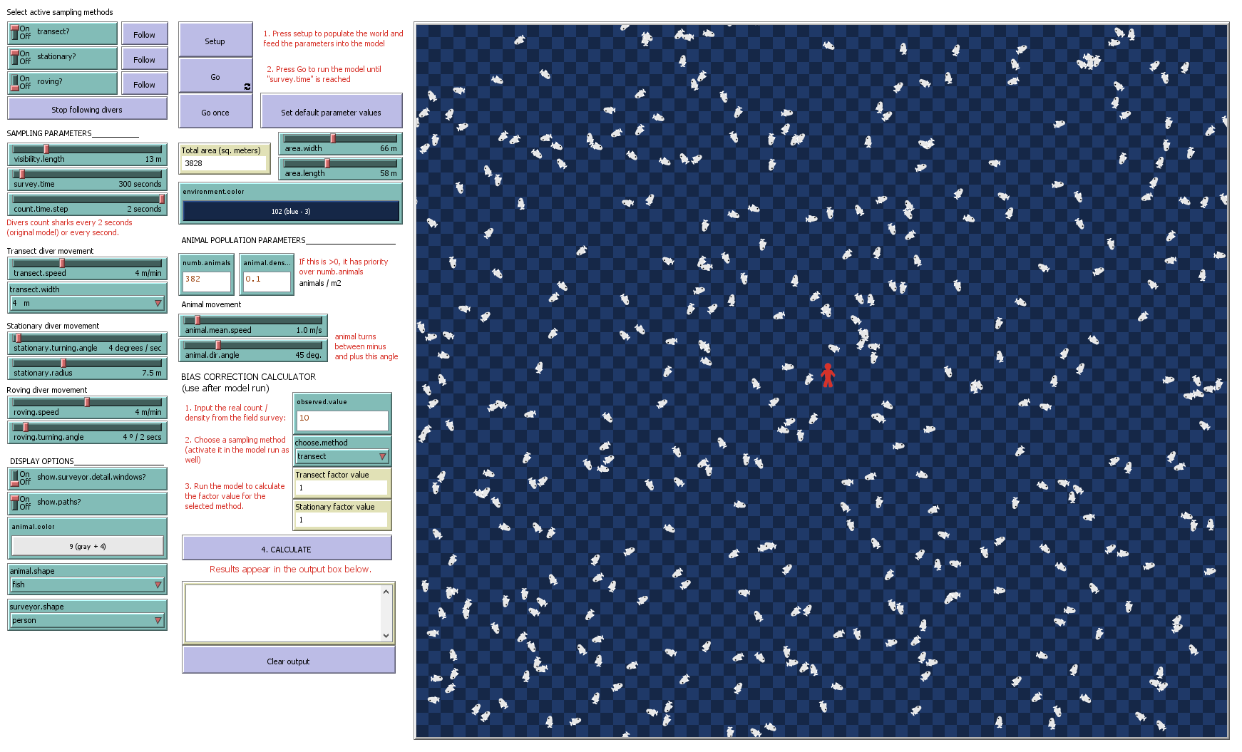 The "setup" button feeds all parameter values into the model, places the selected surveyors and spreads all the aninmals across the area.