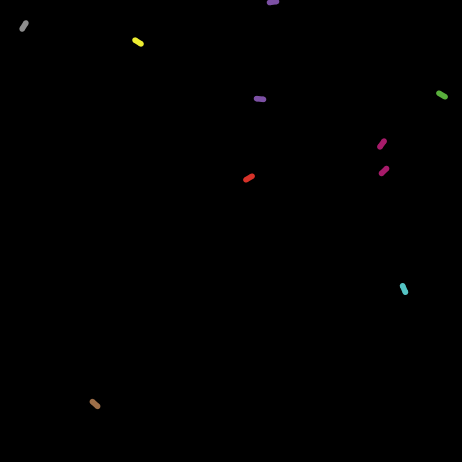 The model starts with different colored E. coli cells, randomly distributed across the world. Each turn, each E. coli moves randomly around the world and has a chance (equal for all types of E. coli) of reproducing to form to two daughter cells of its type (of the same color).