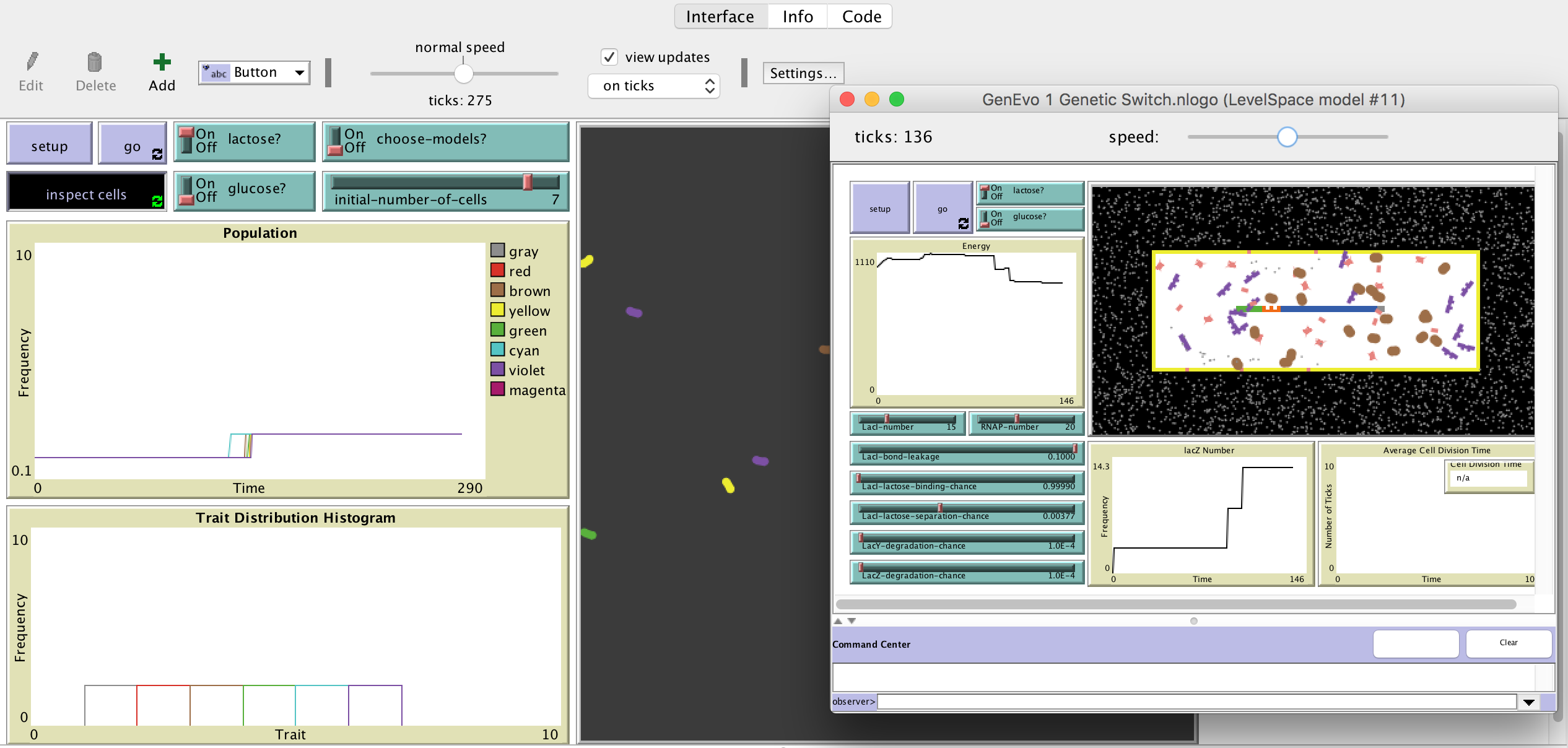 Change the environmental conditions using the LACTOSE? and GLUCOSE? switches and observe the different behaviors of population. (Note: You have to run the model for a few hundred ticks in order to observe cellular behavior.)