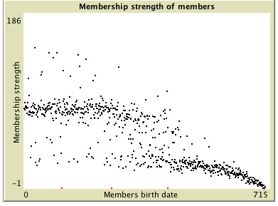 Members have a join date; a time-variant membership strength; they can acquire temporarily extra chattiness when they receive comments from other members or the community manager. There are also properties keeping track of the member's latest activity and whether or not she is stil active.
