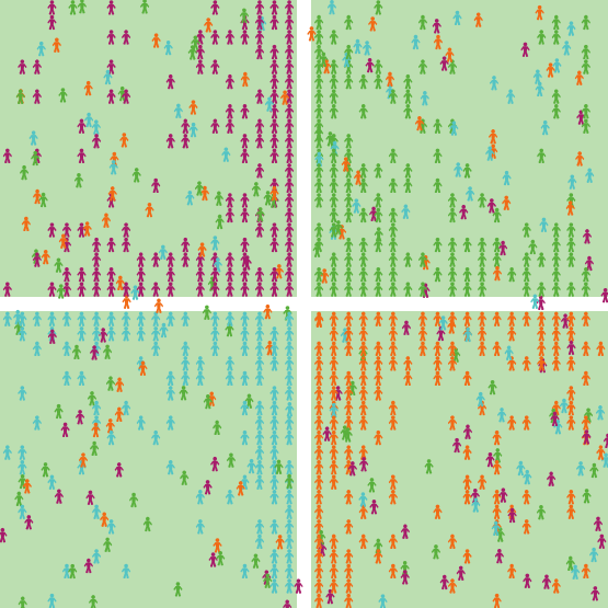 turtles-own [ wealth ;; the wealth of each person happy? ;; the state of happiness and when people are at their related residence, they feel happy otherwise they feel unhappy ] ;;;;;;;;;;;;;;;;;;;;setup procedure to setup ca set-default-shape turtles "person" ask patches [ set pcolor green + 3] ;; color of patches ask patches with [pxcor = 0 or pycor = 0 ] [ set pcolor white] ;;seperating lines crt num-of-people [ set happy? false ;; they are unhappy in the initial conditions setxy random-xcor random-ycor ;; people's spatial distribution set wealth random 100 ;; people get a value of wealth in a random manner recolor ;; people set their color based on their wealth ] reset-ticks end ;;;;;;;;;;;;;;;;;;;;go procedure to go if all? turtles [happy?] [stop] ;; if all people are at their related residence they all get happy and model stopes ask turtles with [not happy?] [ ;; move procedure move-to-find ;; if wealth of a person is less than 25 units, he or she will go to southeast of the city to find a suitable residence if wealth < 25 [go-to-southeast] ;; if wealth of a person is greater than or equal to 25 units and less than 50 units, he or she will go to southwest of the city to find a suitable residence if wealth >= 25 and wealth < 50 [go-to-southwest] ;; if wealth of a person is greater than or equal to 50 units and less than 75 units, he or she will go to northeast of the city to find a suitable residence if wealth >= 50 and wealth < 75 [go-to-northeast] ;; if wealth of a person is greater than or equal to 75 units and less than 100 units, he or she will go to northwest of the city to find a suitable residence if wealth >= 75 and wealth < 100 [go-to-northwest] ] tick end ;;;;;;;;;;;;;;;;;;;;;;;;;;;;;helper procedures to go-to-southeast ;; if they are at the southeast, get stabilised otherwise move to find the southeastern area ifelse ((pxcor > 0 and pycor < 0) ) [ stabilise ] [ move-to-find ] end to go-to-southwest ;; if they are at the southwest, get stabilised otherwise move to find the southwestern area ifelse ((pxcor < 0 and pycor < 0) ) [ stabilise ] [ move-to-find ] end to go-to-northeast ;; if they are at the northeast, get stabilised otherwise move to find the northeastern area ifelse ((pxcor > 0 and pycor > 0) ) [ stabilise ] [ move-to-find ] end to go-to-northwest ;;;; if they are at the northwest, get stabilised otherwise move to find the northwestern area ifelse ((pxcor < 0 and pycor > 0) ) [ stabilise ] [ move-to-find ] end to move-to-find ;; move procedure, a turtle-procedure rt random 90 lt random 90 if not can-move? 1 [ rt 180 ] fd 1 end to stabilise ;; stabilise procedure, a turtle-procedure ifelse not any? other turtles-here [ set happy? true setxy pxcor pycor ] [ move-to-find ] end to recolor ;; coloring procedure, a turtle-procedure if wealth < 25 [set color orange] ;; people with a wealth value less than 25 units get an orange color if wealth >= 25 and wealth < 50 [set color cyan] ;; peolpe with a wealth value greater than or equal to 25 units and less than 50 units, they get a cyan color if wealth >= 50 and wealth < 75 [set color green ] ;; peolpe with a wealth value greater than or equal to 50 units and less than 75 units, they get a green color if wealth >= 75 and wealth < 100 [set color magenta] ;; peolpe with a wealth value greater than or equal to 75 units and less than 100 units, they get a magenta color end