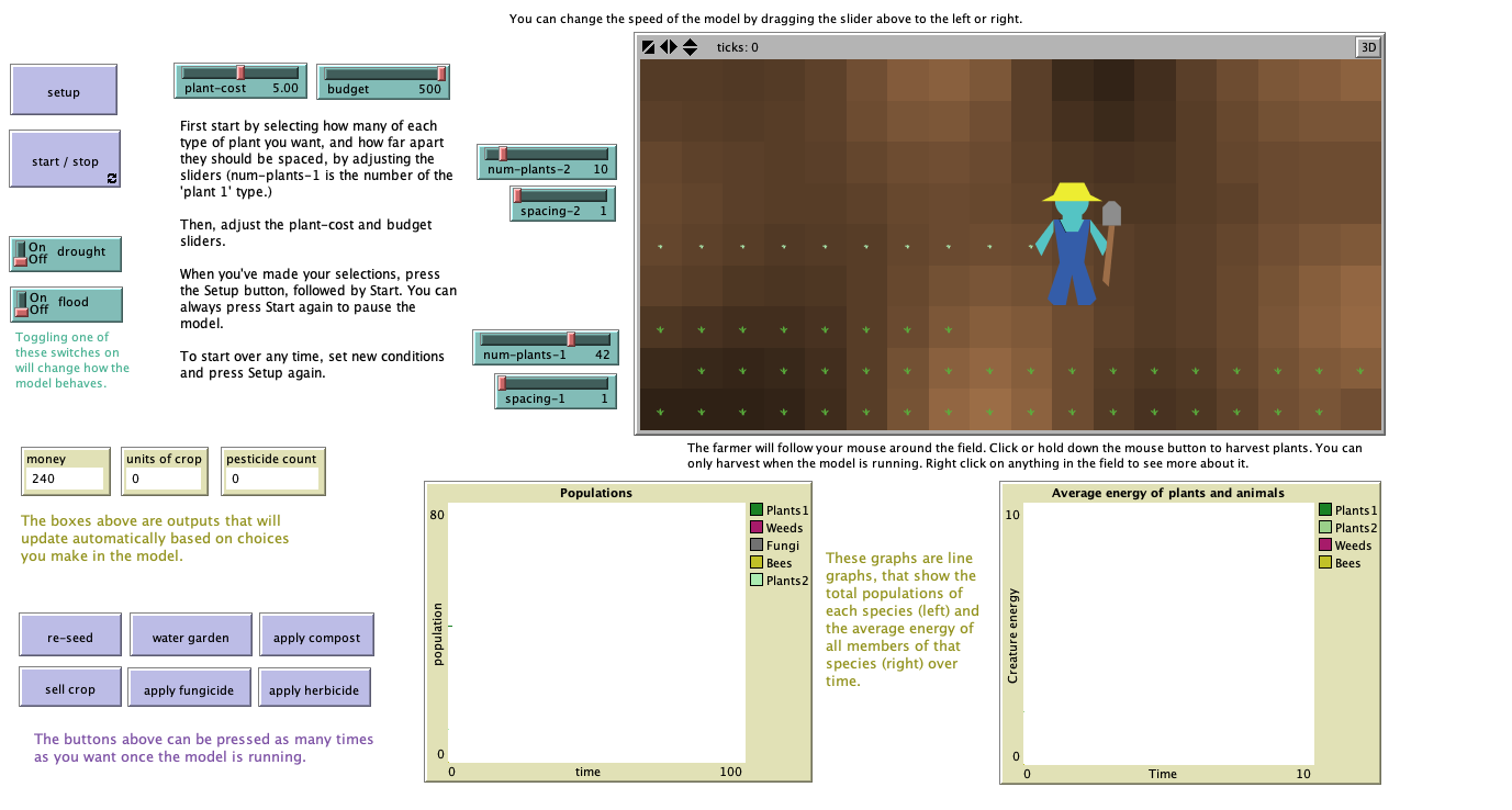 When you're ready to start, press 'Start/Stop', and then the farmer will follow your mouse. Things will begin to grow in the garden, hold down the mouse button to harvest a plant. You can click the interface buttons (light purple) at any time while the model is running, or press 'Start/Stop' again to pause it.